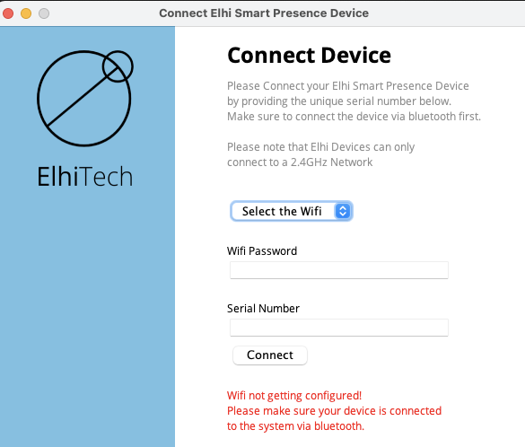 If you are getting the above error, it's possibly because the application isn't able to find your Elhi Device. As discussed in the Getting started guide, Elhi uses Bluetooth to configure the Wifi Settings for the very first time. So this can be fixed by checking that your Elhi is powered on and paired with your computer via Bluetooth. Even if it says not connected that should be okay. It should just be appearing on your Bluetooth pane. If you have tried everything and nothing seems to be working, we would advise you to contact us.