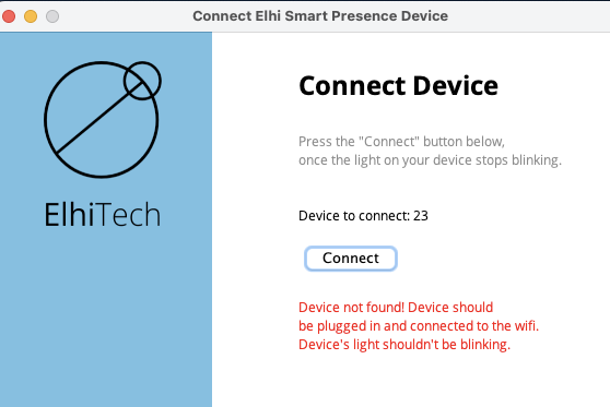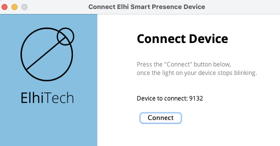 When you are on this pane, the Elhi device will be configured and will be trying to connect to the Wifi network. During this time it will be blinking (blue). Once the device is connected it will show a static blue light. In that case, you can simply press connect and you will be good to go.
